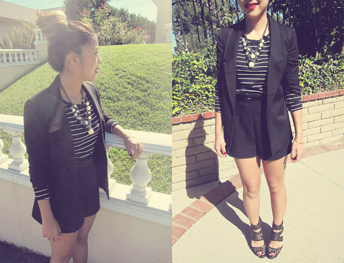 C's Outfit: Blazer- Urban Outfitters (Gift from J), Shirt- H&M, Shorts & Necklace- Forever21,